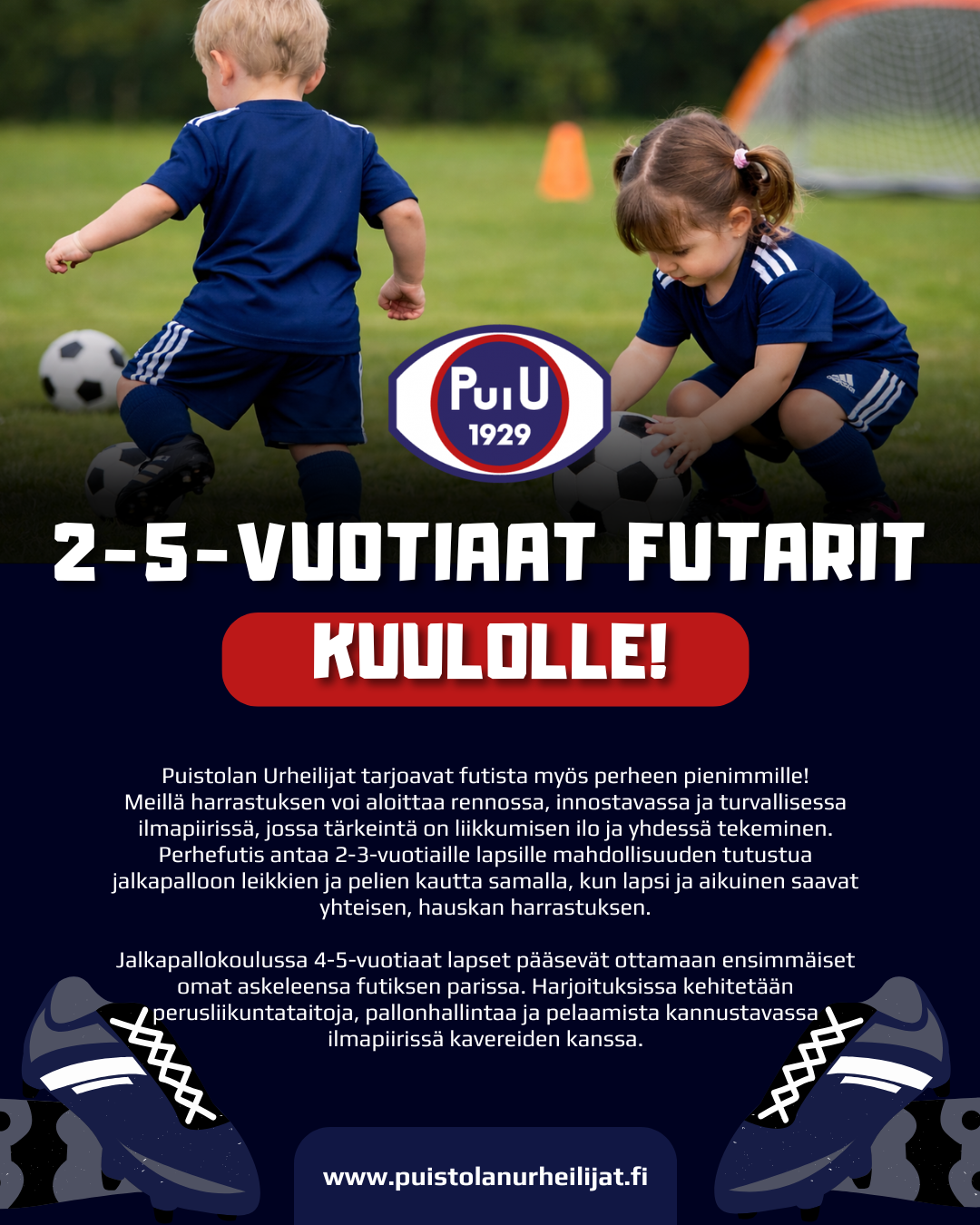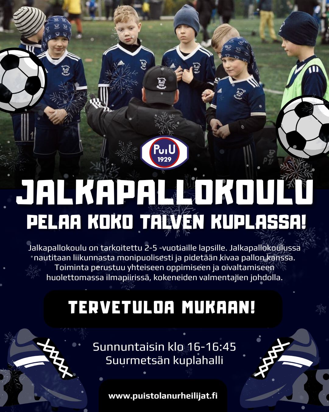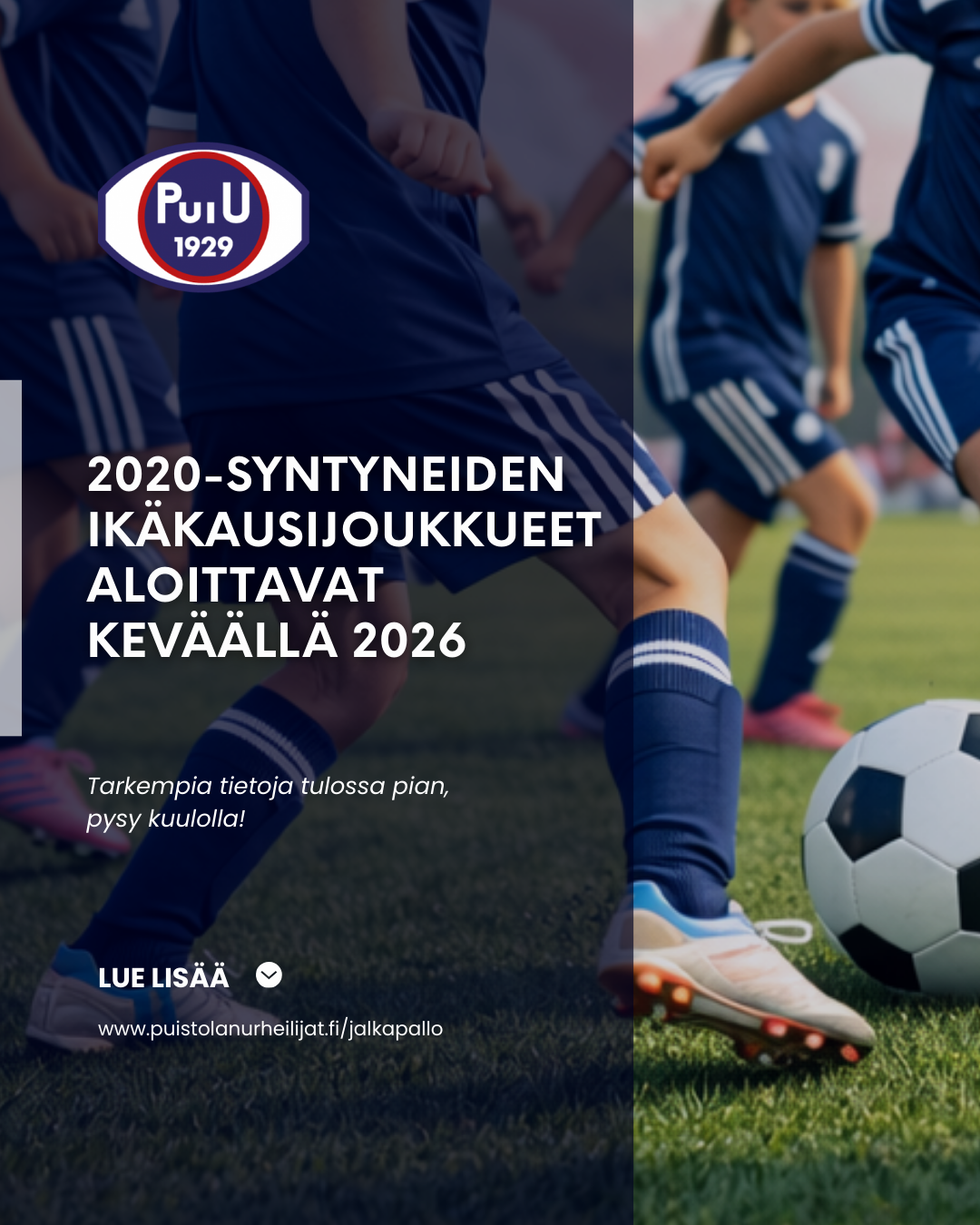 Puistolan Urheilijat käynnistää keväällä 2026 uudet tyttöjen ja poikien ikäkausijoukkueet vuonna 2020 syntyneille lapsille!🤩 Liikuntaa, uusia kavereita ja ensimmäisiä askeleita jalkapallon maailmassa turvallisessa ja kannustavassa ympäristössä. Toiminnassa painoitetaan leikkiä, yhdessä tekemistä ja liikunnan riemua – jokainen lapsi on tervetullut mukaan omana itsenään.❤️ Tule mukaan aloittamaan yhteinen futismatka Puistolan Urheilijoissa! 💙⚽️ Tytöt – https://puistolanurheilijat.fi/tytot-2020/Pojat – https://puistolanurheilijat.fi/pojat-2020/