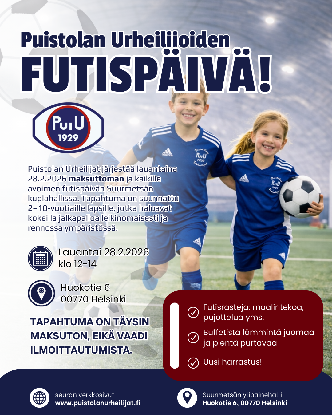 Puistolan Urheilijat järjestää lauantaina 28.2.2026 maksuttoman ja kaikille avoimen futispäivän Suurmetsän kuplahallissa. Tapahtuma on suunnattu 2–10-vuotiaille lapsille, jotka haluavat kokeilla jalkapalloa leikinomaisesti ja rennossa ympäristössä. Futispäivän aikana lapset pääsevät kokeilemaan erilaisia futisrasteja, kuten pujottelua, maalintekoa sekä laukauksia tutkaan ja tarkkuusmaaleihin. Tavoitteena on tarjota iloa, liikettä ja onnistumisen kokemuksia ilman suorituspaineita. Tapahtuma järjestetään Puistolan Urheilijoiden lämpimässä […]