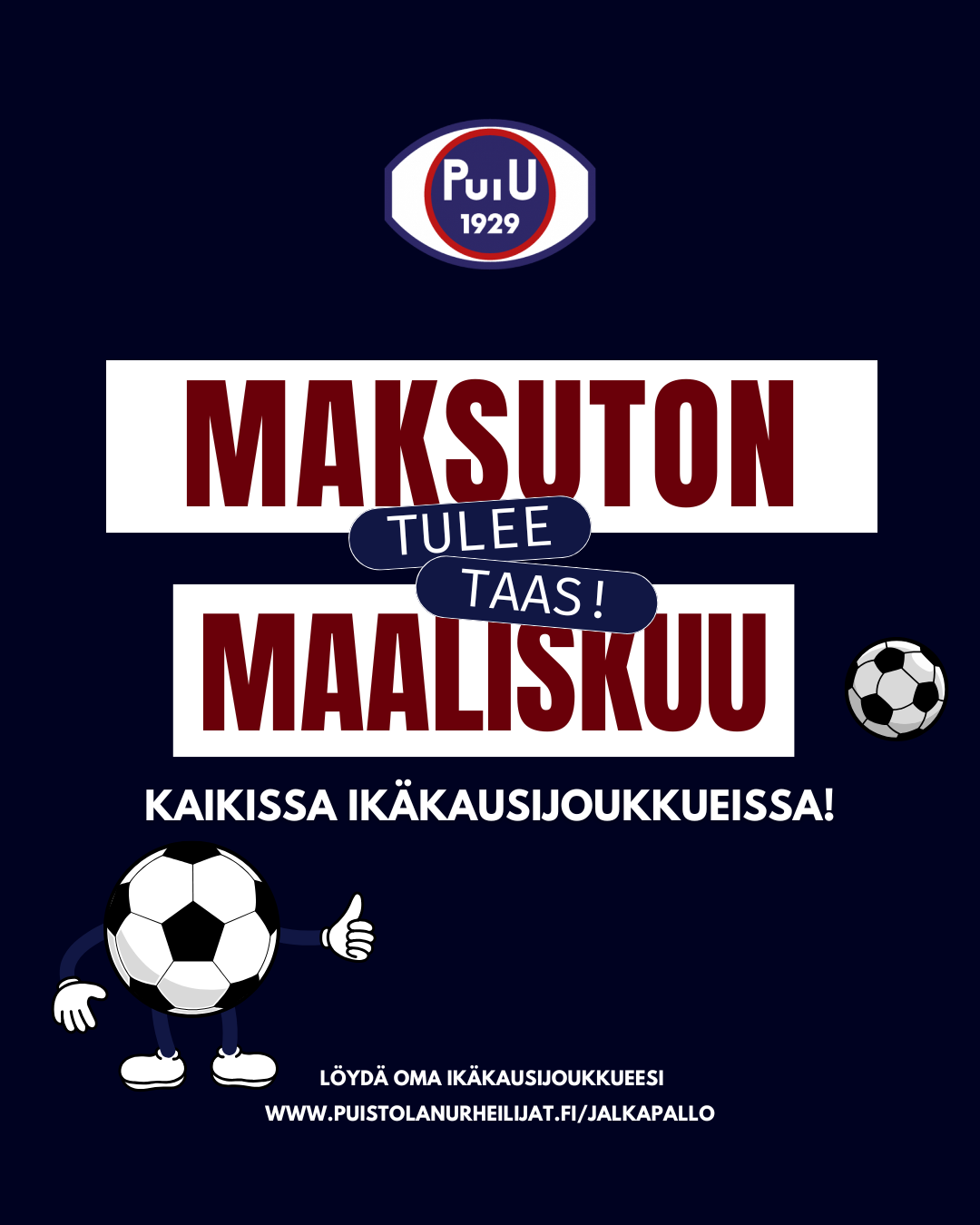 Puistolan Urheilijoiden jalkapallon Maksuton maaliskuu on pian taas täällä! Kaikki uudet, aloittavat pelaajat pääsevät treenaamaan koko maaliskuun maksutta kaikissa ikäkausijoukkueissamme. Nyt on loistava mahdollisuus tulla kokeilemaan jalkapalloa hyvässä porukassa ja matalalla kynnyksellä! Ennen harjoituksiin osallistumista olethan yhteydessä oman ikäkausijoukkueen joukkueenjohtajaan, jotta saat tarkemmat ohjeet ja tiedot harjoituksista. Lisätietoja ja ikäkausijoukkueet:www.puistolanurheilijat.fi/jalkapallo Tervetuloa mukaan!