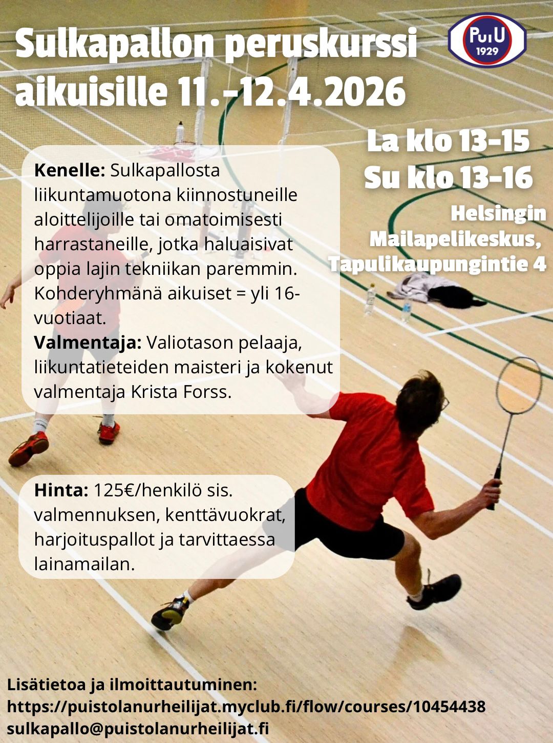 Kurssilla opetellaan lajin perustekniikat: mailaotteet, lyöntitekniikat etu- ja takakentältä sekä liikkumistekniikan perusteet. Tavoitteena on, että kurssin jälkeen lajin harrastamisesta pystyy nauttimaan terveenä, kun lyönnit onnistuvat paremmin sekä tapaturma- ja rasitusvammariski vähenee merkittävästi. Sulkapallosta liikuntamuotona kiinnostuneille aloittelijoille tai omatoimisesti harrastaneille, jotka haluaisivat oppia lajin tekniikan paremmin. Lisätietoa https://puistolanurheilijat.fi/sulkapallo/aikuisten-peruskurssi/