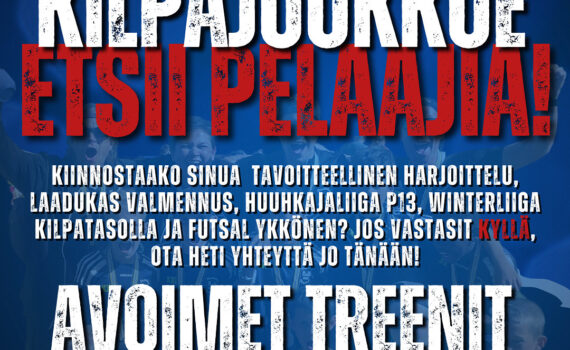 AVOIMET HARJOITUKSET tavoitteellisille futaajille! Puistolan Urheilijat etsii uusia pelaajia Poikien 2013-2014 kilpajoukkueeseen jonka tavoitteena on nousu ykköseen. Harjoittelemme tavoitteellisesti 4 kertaa viikossa. PELAAMME TALVELLA: – Winterliiga – Kilpataso – Huuhkajaliiga P13 – Futsal ykkönen Harjoituspelejä pyrimme pelaamaan myös mahdollisimman paljon talven aikana. Etsimme pelaajia, joilla on asennetta, intoa ja halu […]